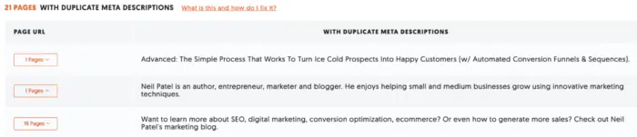 Chaque ligne détaille un point spécifique, comme les méta-descriptions dupliquées sur plusieurs pages. À vous d’évaluer s’il faut intervenir ou non.